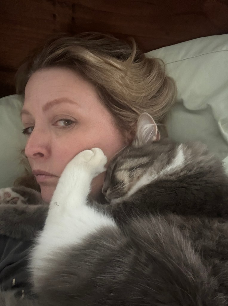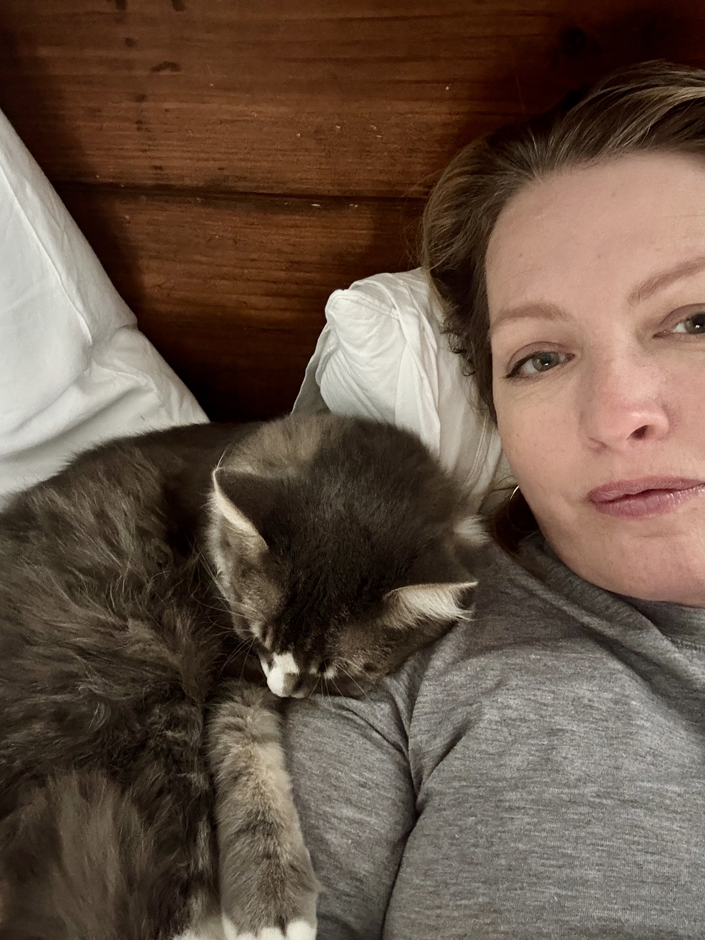 And quasi-finally just a funny thing: last weekend I actually put on makeup and did my hair… and then took a midday nap- resulting in this glamour shot. I swear I was just documenting the cat as it thrills me every time he curls up like that.