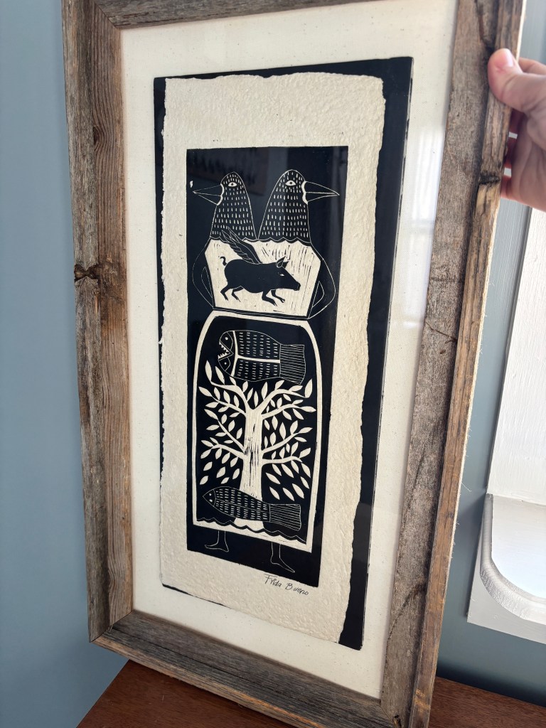 I need to reset it as it’s shifted in the frame, so that’s annoying. (I bought that frame for $3.99 yesterday at Goodwill too, so if it takes some finagling it’s okay.) I do love a linocut, what can I say.