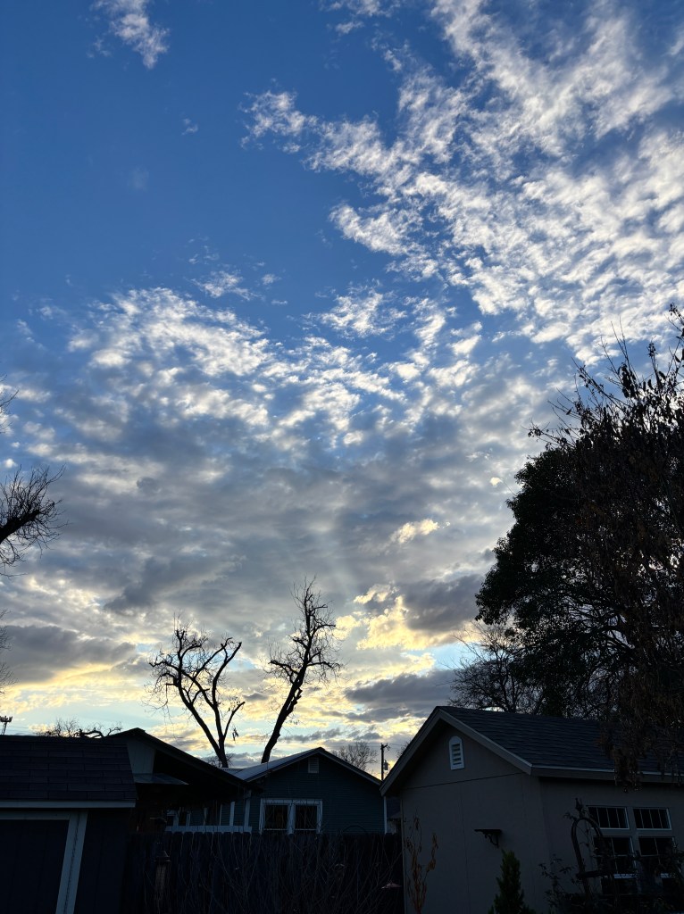Earlier I had run out to get steaks and had to go to two different grocery stores as the first was out of steaks. And both times walking in and out was in my very very very favorite weather- a soft cool mist/drizzle with a light breeze. I can literally feel my skin come alive in that weather, I LOVE it. As I walked out of the second grocery store (expensive ass steaks in hand) I passed a family all in umbrellas and with rain jackets on… and there I was with just cutoff shorts and a Mexican embroidered top on and I just kinda marveled at people working so hard to avoid the thing that I loved so much, I mean hell, this weather is a GIFT and it wasn’t even in the forecast! And then I went… ah. Well you clever bastard, look at that, I DID get a Valentine’s gift after all! So that did make me happy to think of it all like that. When I got home I went outside again and drank a beer and watched the sunset and enjoyed the misty weather.