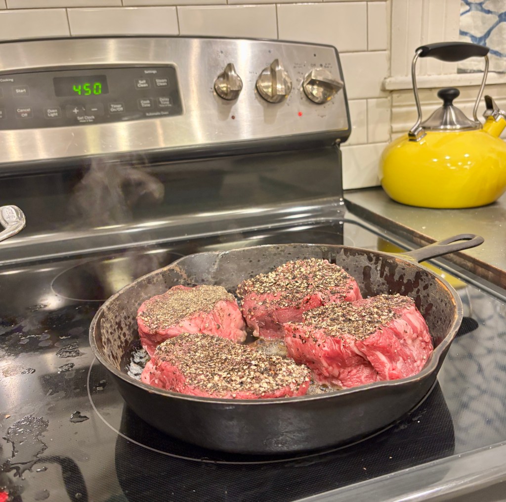 I made Steak au Poivre for dinner (pan seared steaks with a pepper crust and a cognac and cream sauce.) The cognac gets lit on fire, it’s all very fancy, and I keep MEANING to take pics of the entire process… but it goes quickly and so I invariably forget.