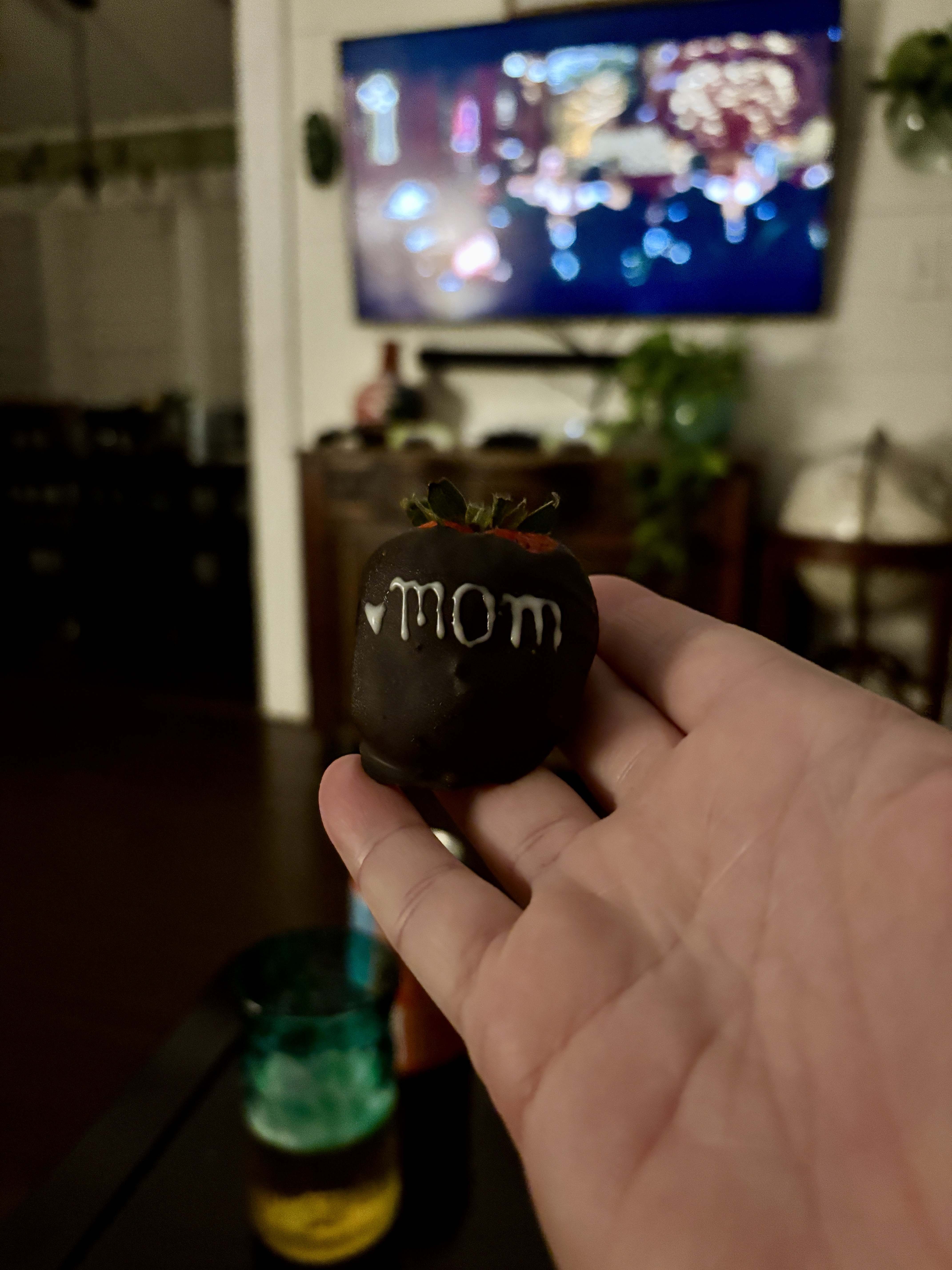 My oldest got me this awesome mug- I loved a tall coffee mug with no handle, it’s perfect and I’m drinking from it now in fact. And my 16 year old cleaned the kitchen and made me chocolate covered strawberries. Personalized them, even! The youngest cleaned the living room and fed the dogs. Less a gift and more an “I made her do it” chore but whatever. I’ll take that too.