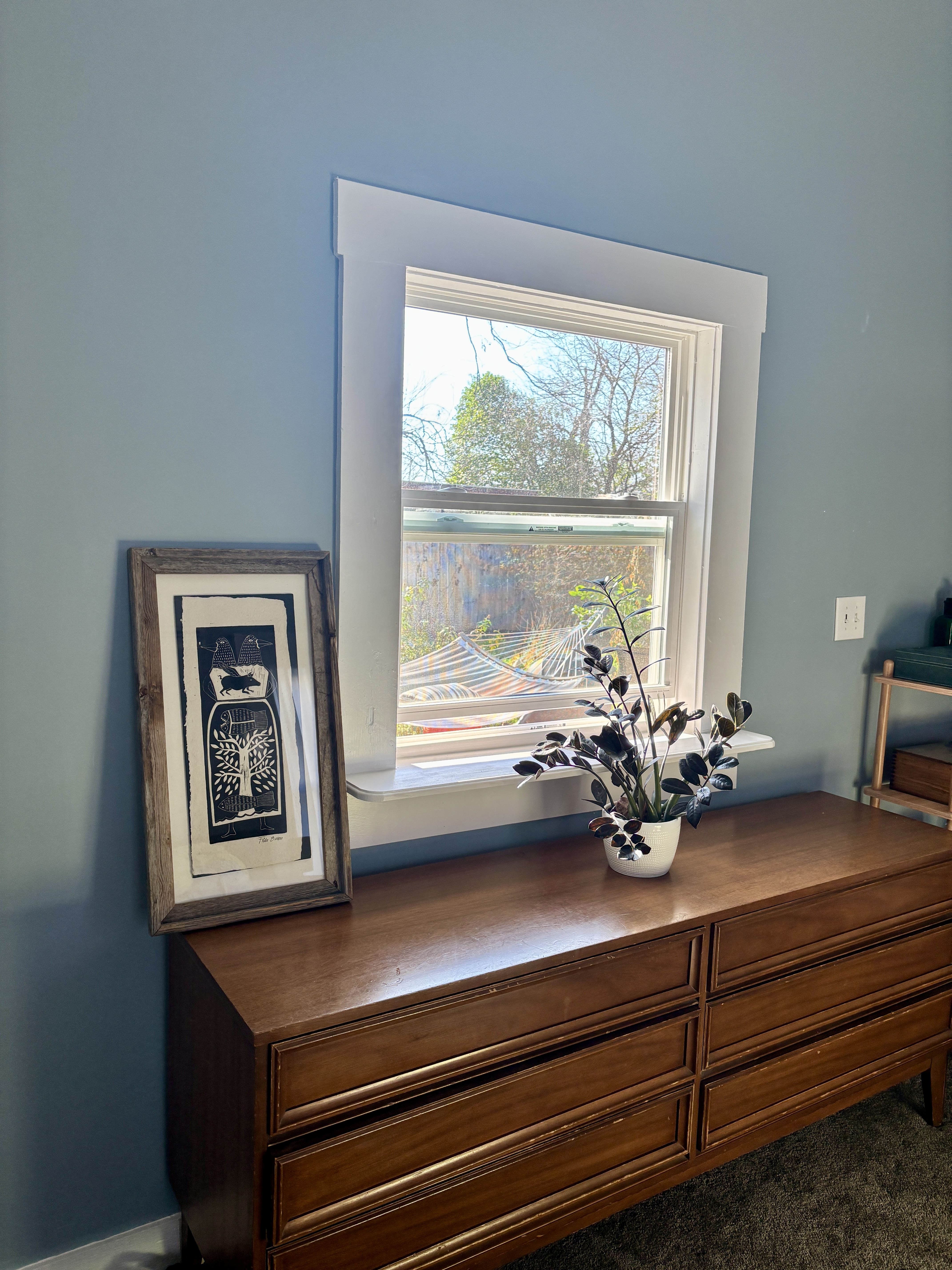 Maybe you could tell from that closeup that the wall is now painted and the furniture is finally moved back. I have the new curtain rod in today, and so at some point I’ll cut and hem the curtains and get that all up. And I need to touch up the dresser as it’s looking mighty scuffed, I’m realizing now… But. We were talking about Friday and the stuff I bought.