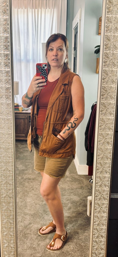 I can start standing up straight like ANYTIME, but it actually was hella cute for a casual outfit- and while simple as all get out, it also was better than just my husbands pants I cut off into shorts (I don’t want to talk about those fitting perfectly), and a plain tshirt.
