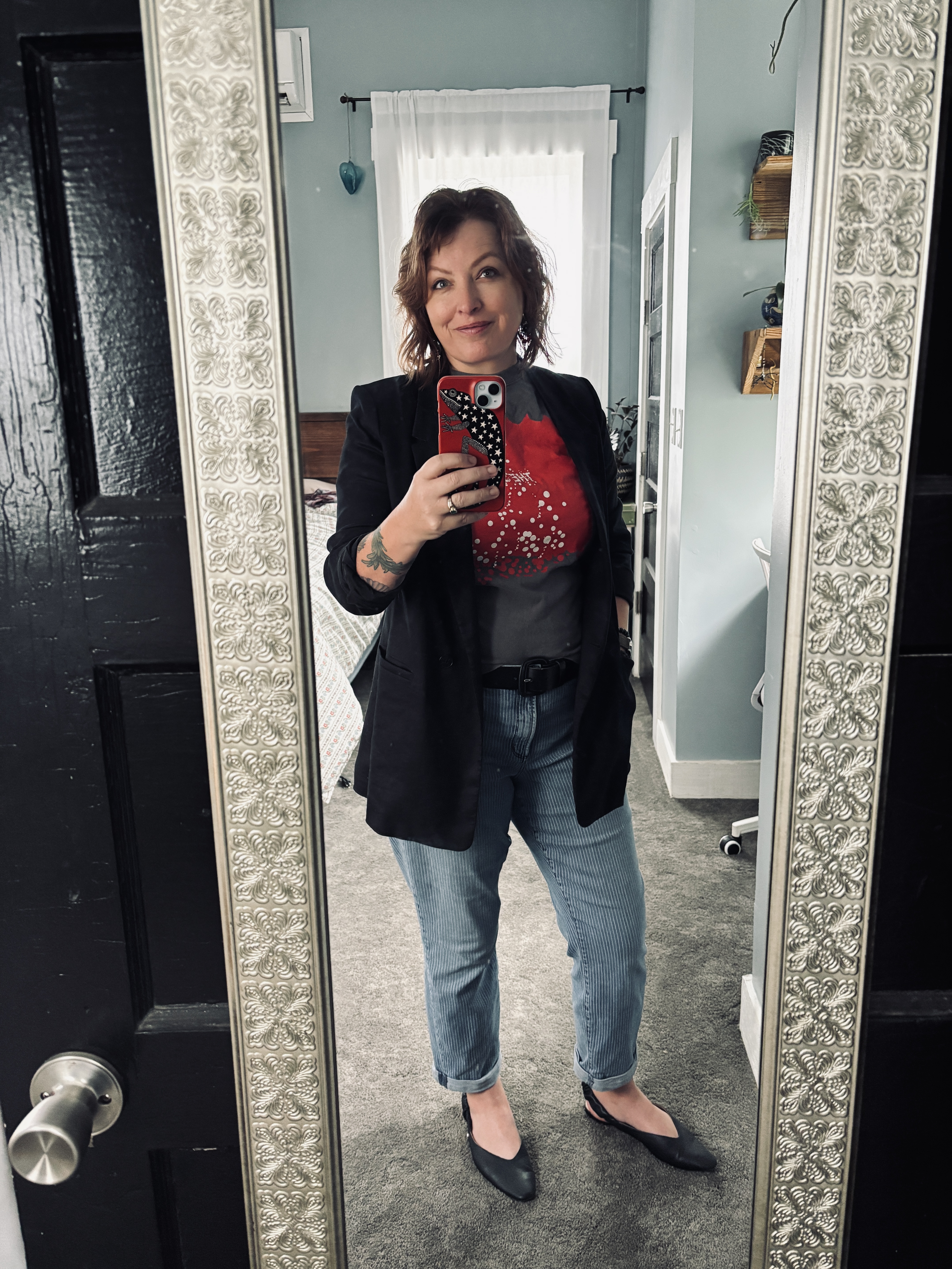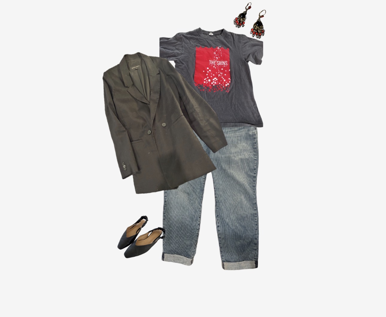 What is really useful is to drop in 5 or six different earrings and then delete out the ones that don’t work- and that’s how I figured out these earrings I never wore worked with the red in this shirt. I wouldn’t have a million years put my red, white, and black earrings with a red, white, black, and grey outfit… which is, one, ridiculous, and, two, really illustrates why something like this works for me, you know? (I am wearing them in that picture, I swear to god.)