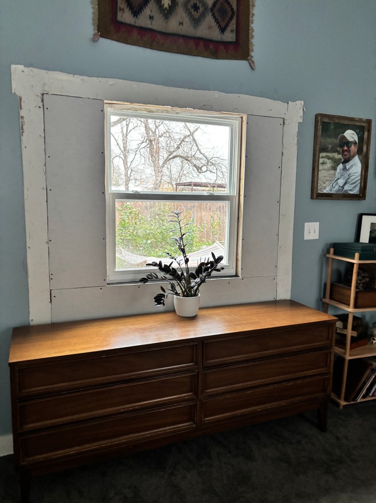 And look. An architectural marvel it is not- but it is the exact style of our other windows, so I’m happy about the uniformity. It also now frames the tree across the yard perfectly this way, whereas two windows as were originally planned would have had a seam right through the middle like the french doors had…so I’m actually happier with just the one window. I’m also happy to have gained some more wall space- the light switches were always weirdly cramped and I have more art I can hang now. It worked out, is what I’m saying.